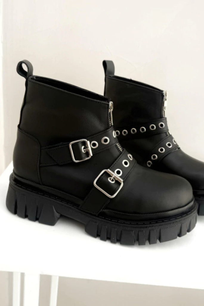 Detalles técnicos: - Material: Cuero Vacuno - Acceso: Cierre lateral - Altura de plataforma: 4 cm