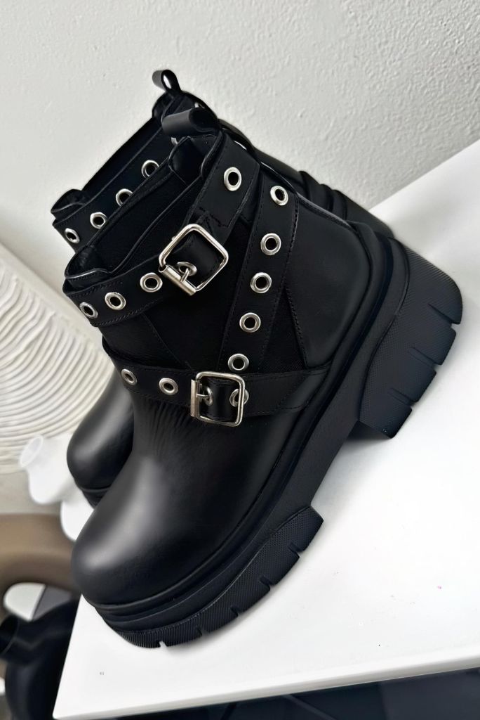 BORCEGO MOKKA CUERO NEGRO: Estos borcegos de cuero vacuno con plataforma ofrecen estilo y comodidad.